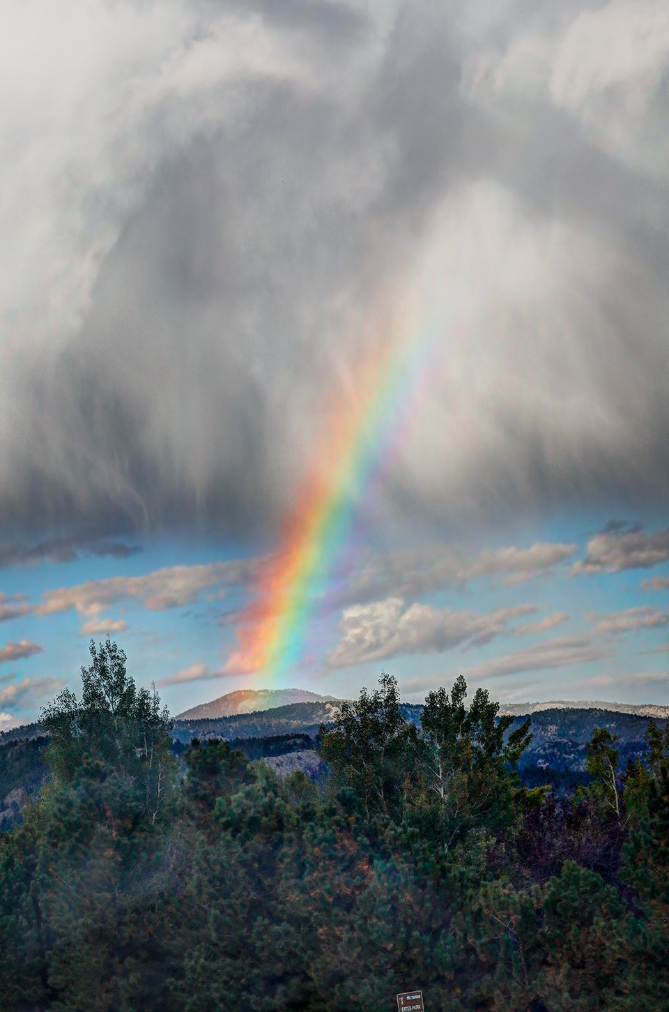 Rain to the east but the late afternoon sun in the west over the Rocky Mountains lit up this partial rainbow.