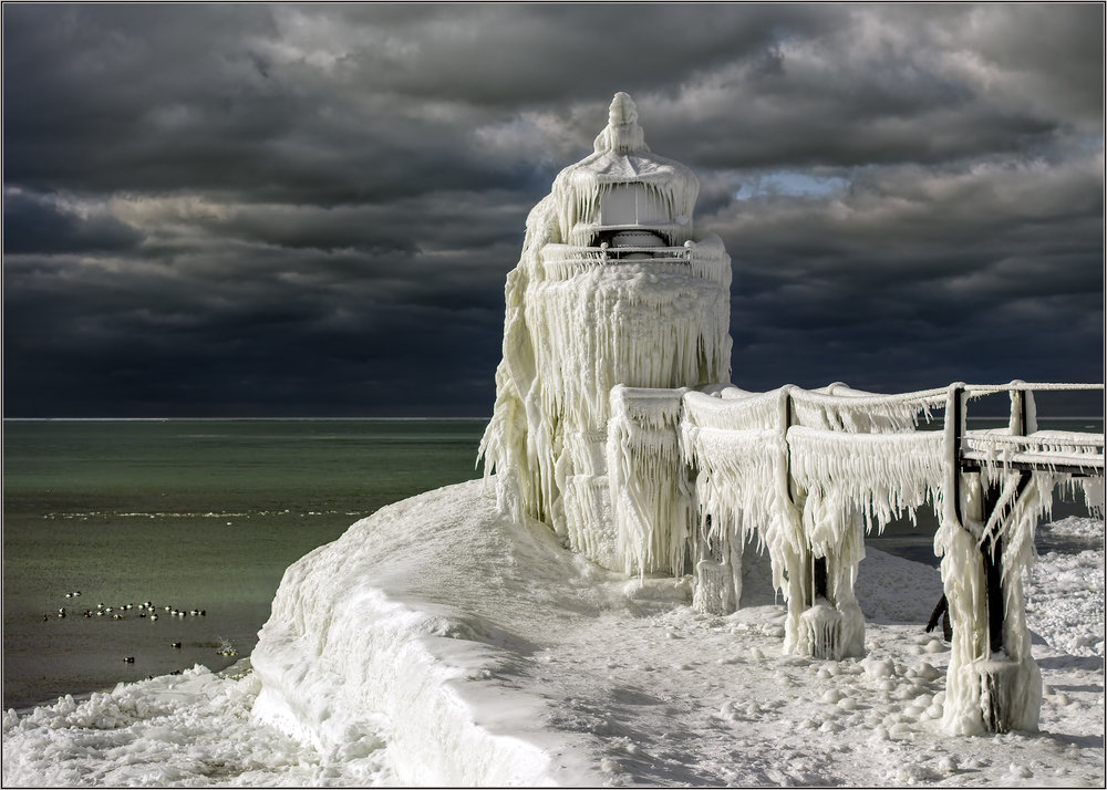 Snow storm clouds rolling into the ice covered St Joseph Lighthouse on Lake Michigan